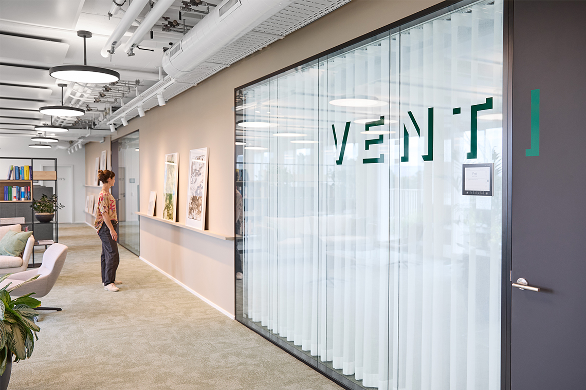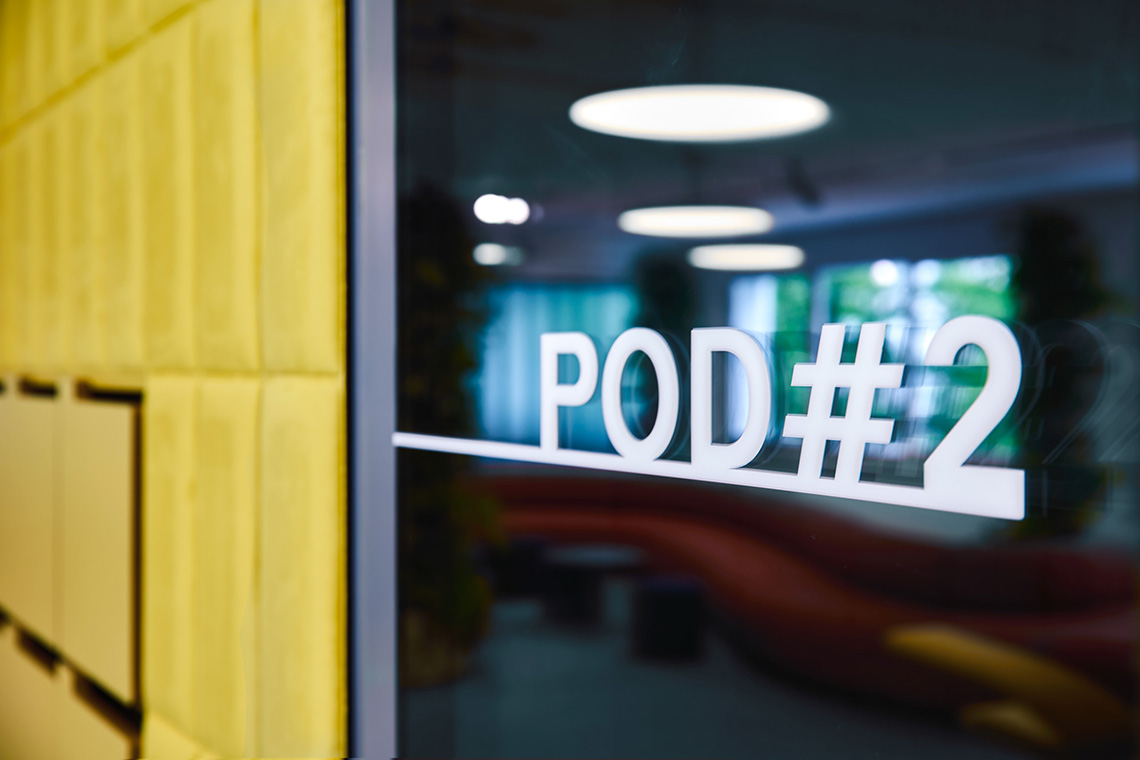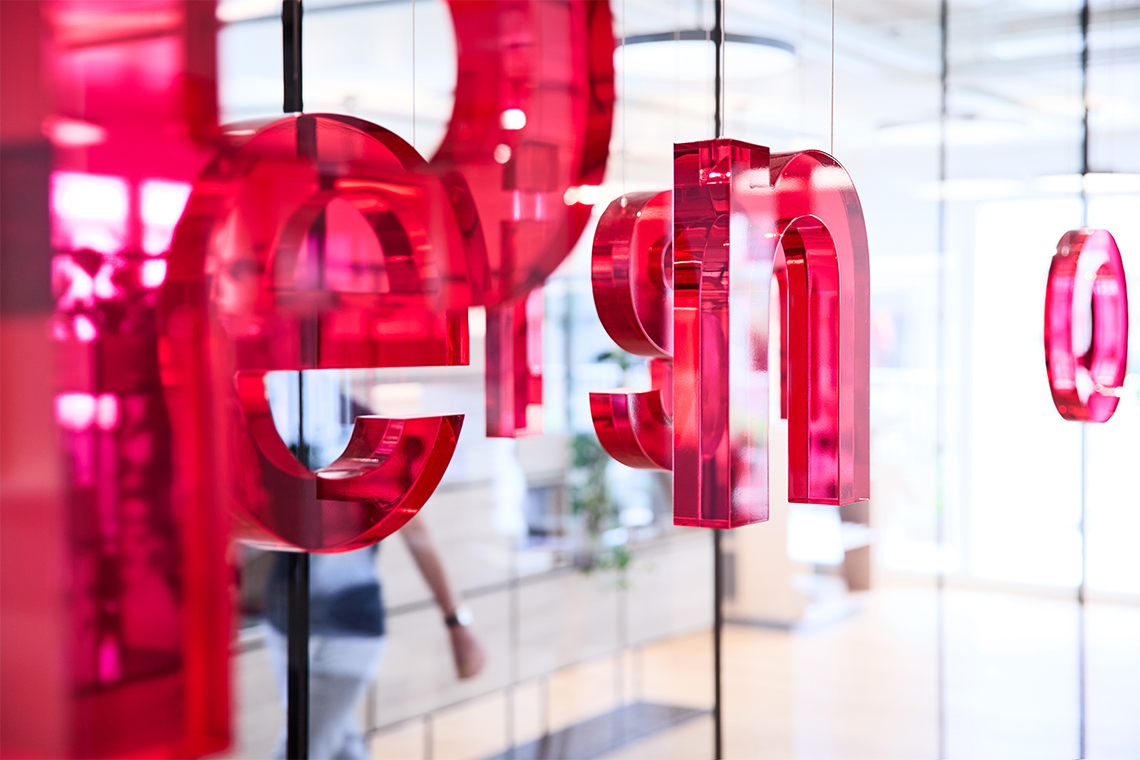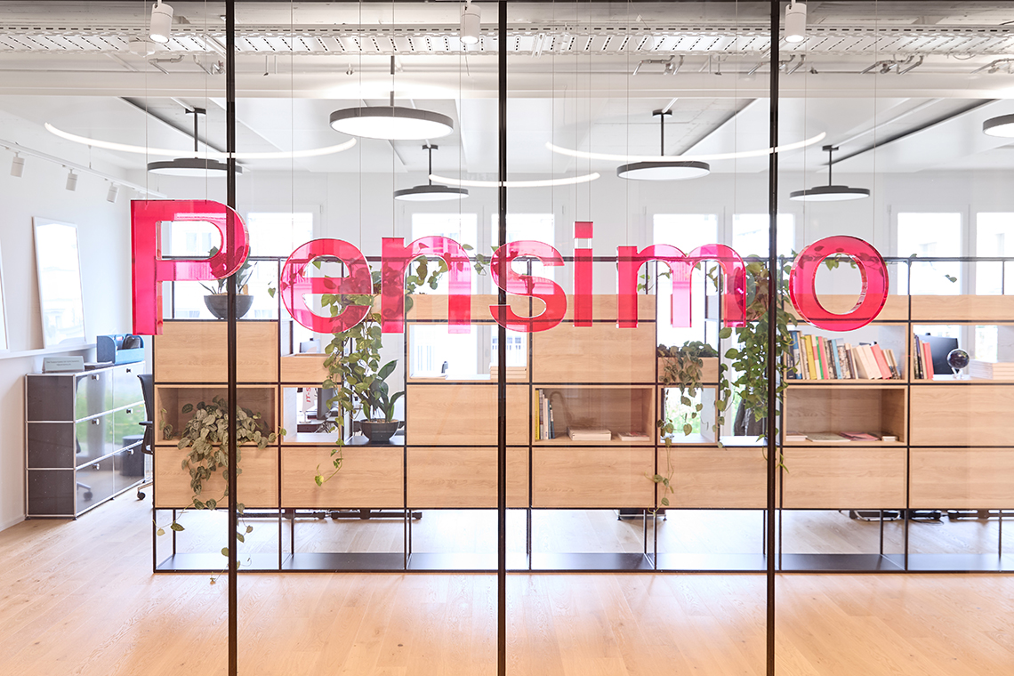 Grosse transparente Buchstaben begrüssen dich im neuen Büro der Anlagestiftung.