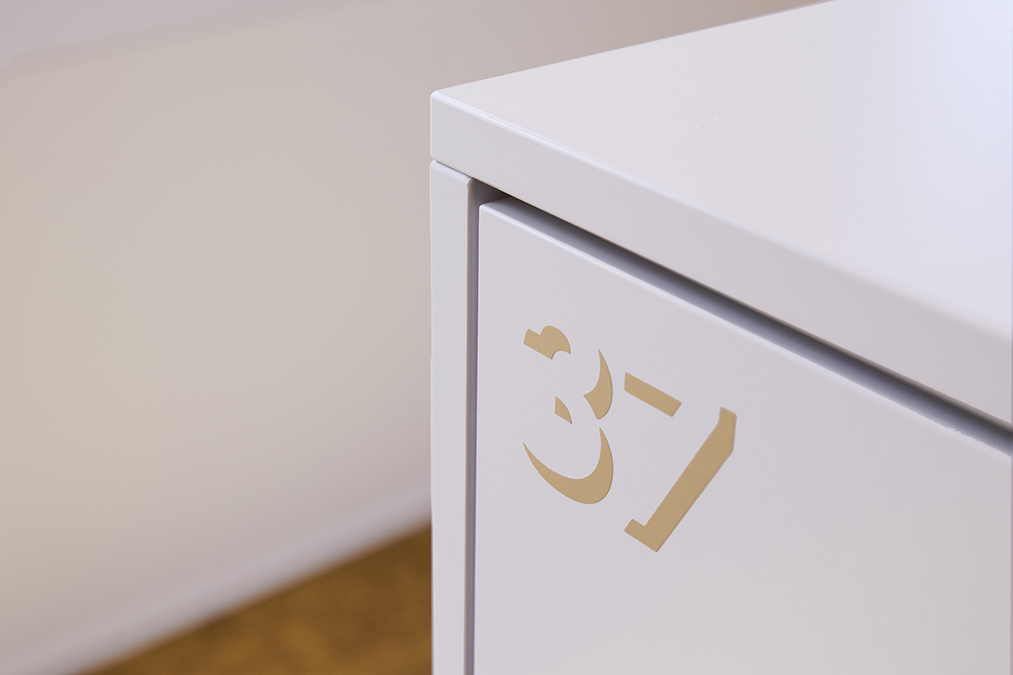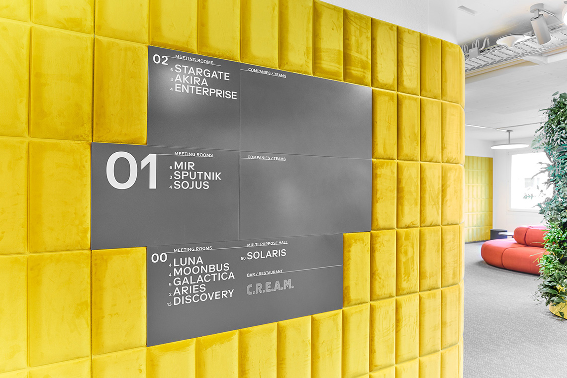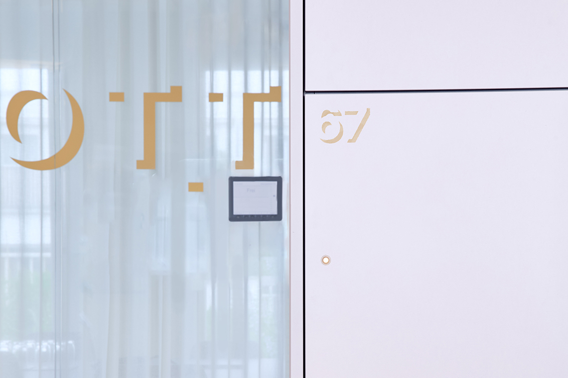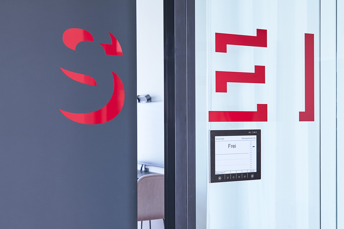Die Anschrift der Sitzungszimmer wird durch ihren Negativraum gebildet;